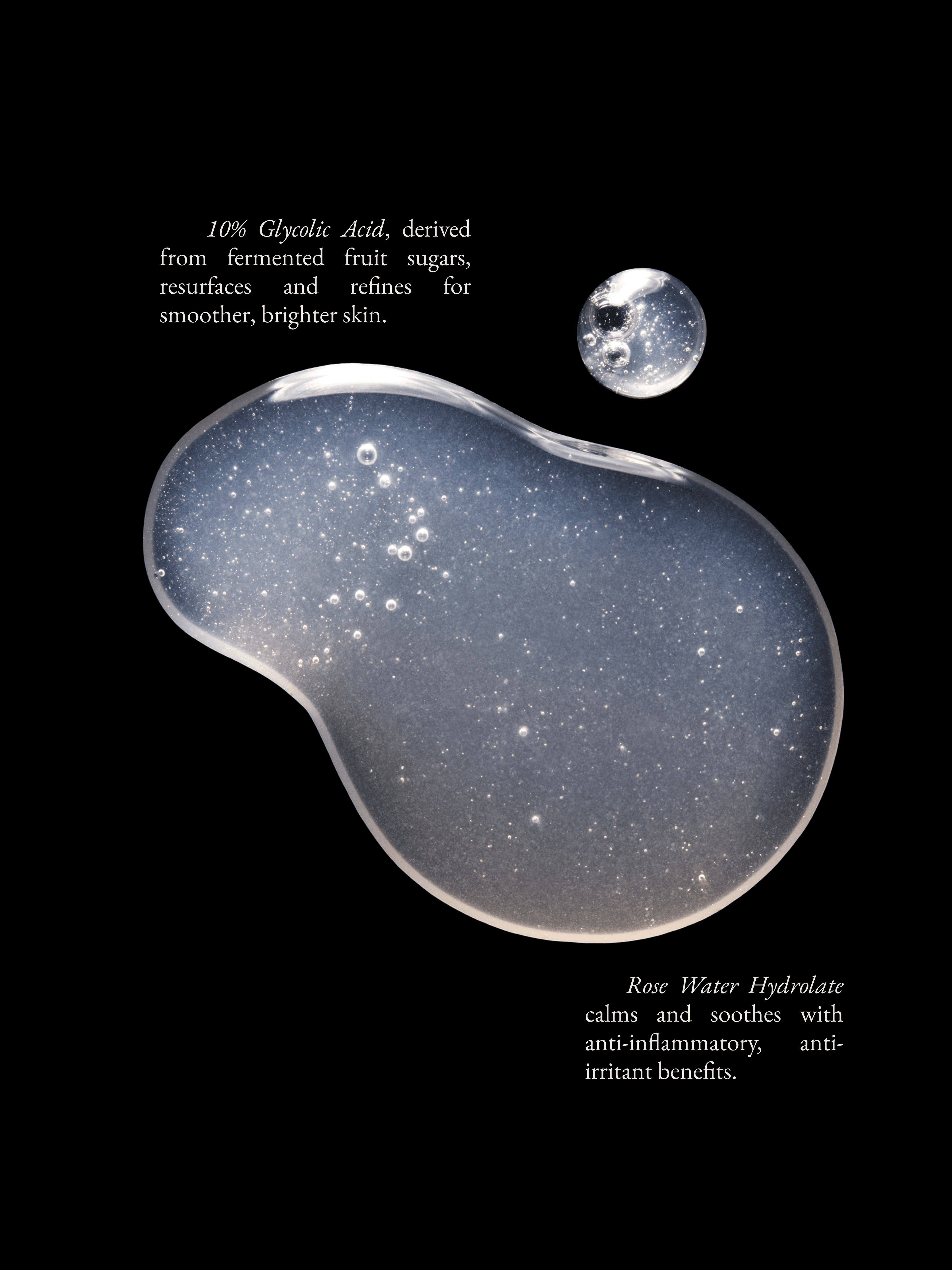 Naturally derived highly concentrated glycolic acid and soothing rosewater to exfoliate, soothe, and hydrate.