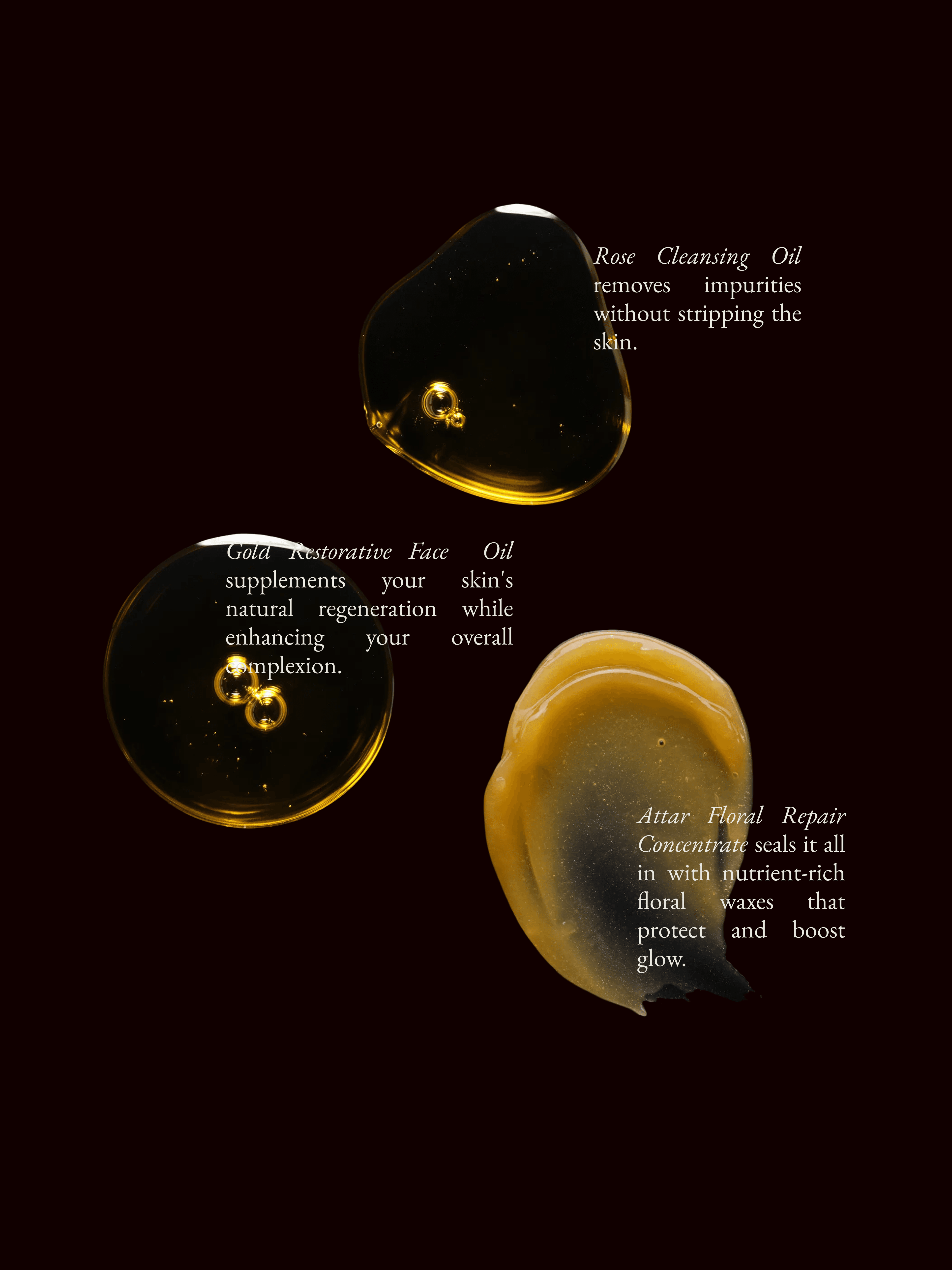 Rose Cleansing Oil removes the impurities of the day without stripping the skin. Gold Restorative Face Oil supplements your skin's natural regeneration while reducing dermal fatigue and enhancing overall complexion. Attar Floral Repair Concentrate seals it all in with nutrient-rich floral waxes that protect and boost glow.