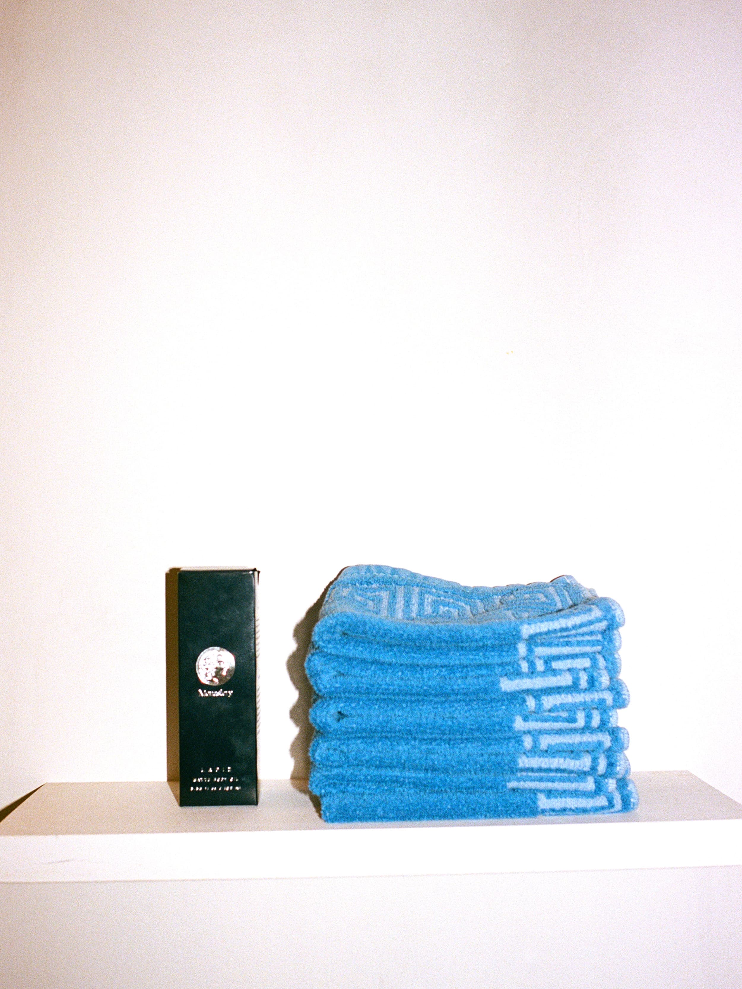 Custom hand towel perfect for removing our cleansing oils. Rectangular French blue terrycloth towel featuring ancient Grecian border. Made in USA.