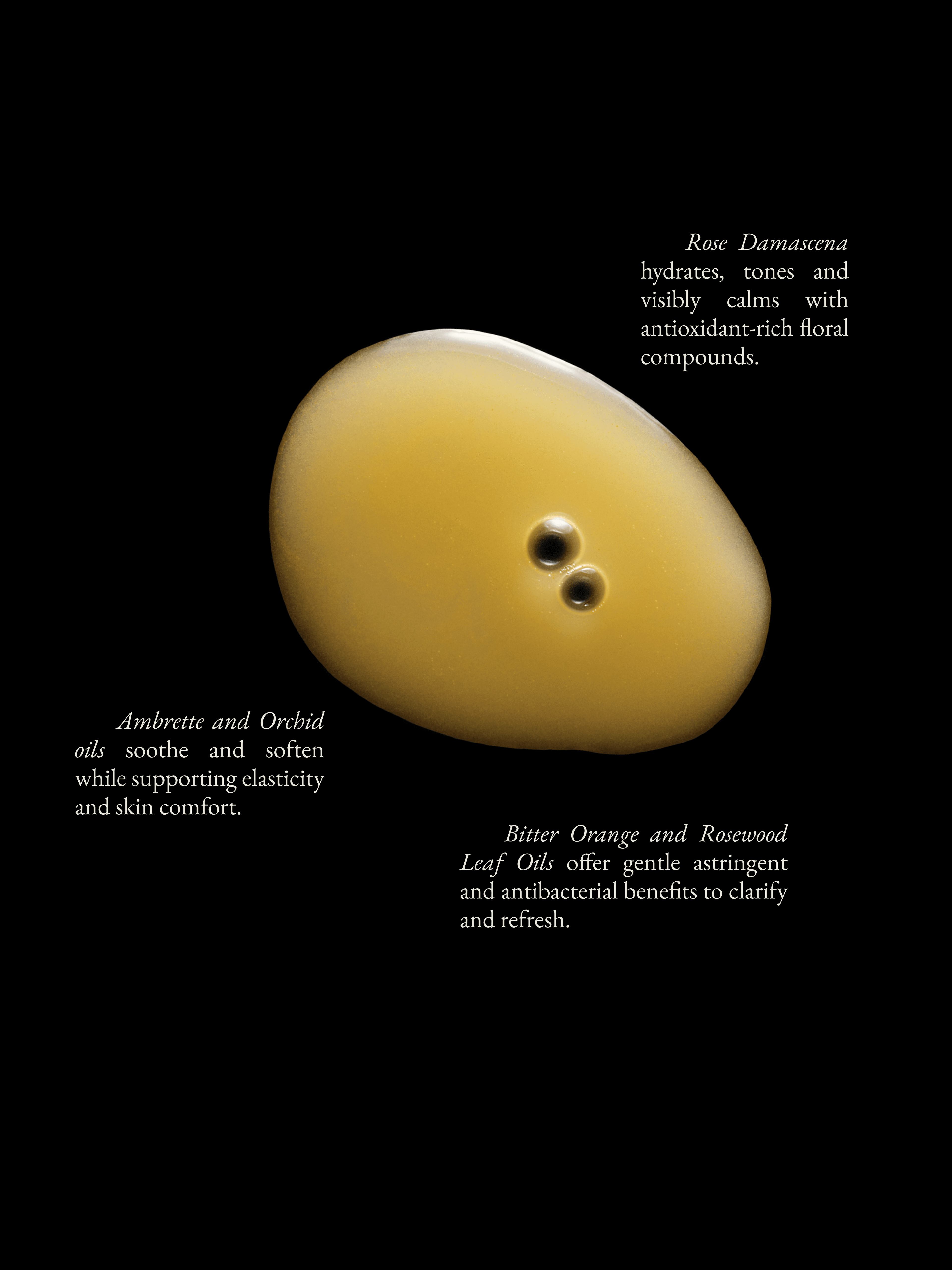 Rose (Rose Damascena) Water, Rosewood Leaf (Aniba Rosaedora) Oil, Rose (Rose Damasenca) Oil, Ambrette (Hibiscus Abelmoschus) Oil, Orchid (Anacamptis Morio) Oil, Orange Bitter (Citrus Aurantium) Oil