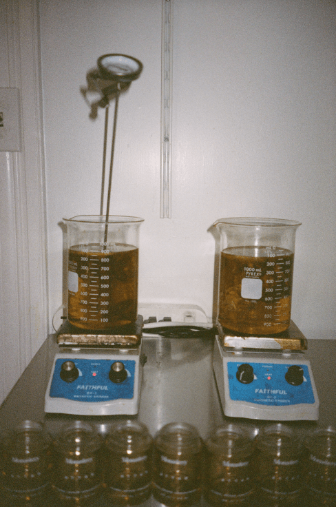 Temperature is key. The process of making Attar is a lot of healing and cooling. We are dealing with extremely precious ingredients so ensuring we’re not overheating is a delicate balance. We take each ingredient and place it into a large glass beaker. Each beaker is heated on a hot plate for a very specific time and at a very specific temperature. This ensures that the ingredients are perfectly mixed. This takes a few hours as we like to heat it slowly. With natural ingredients if they get too hot they can burn, just like when you cook any other organic thing on a stove. Heating slowly not only prevents burning but allows the ingredients to really shine.