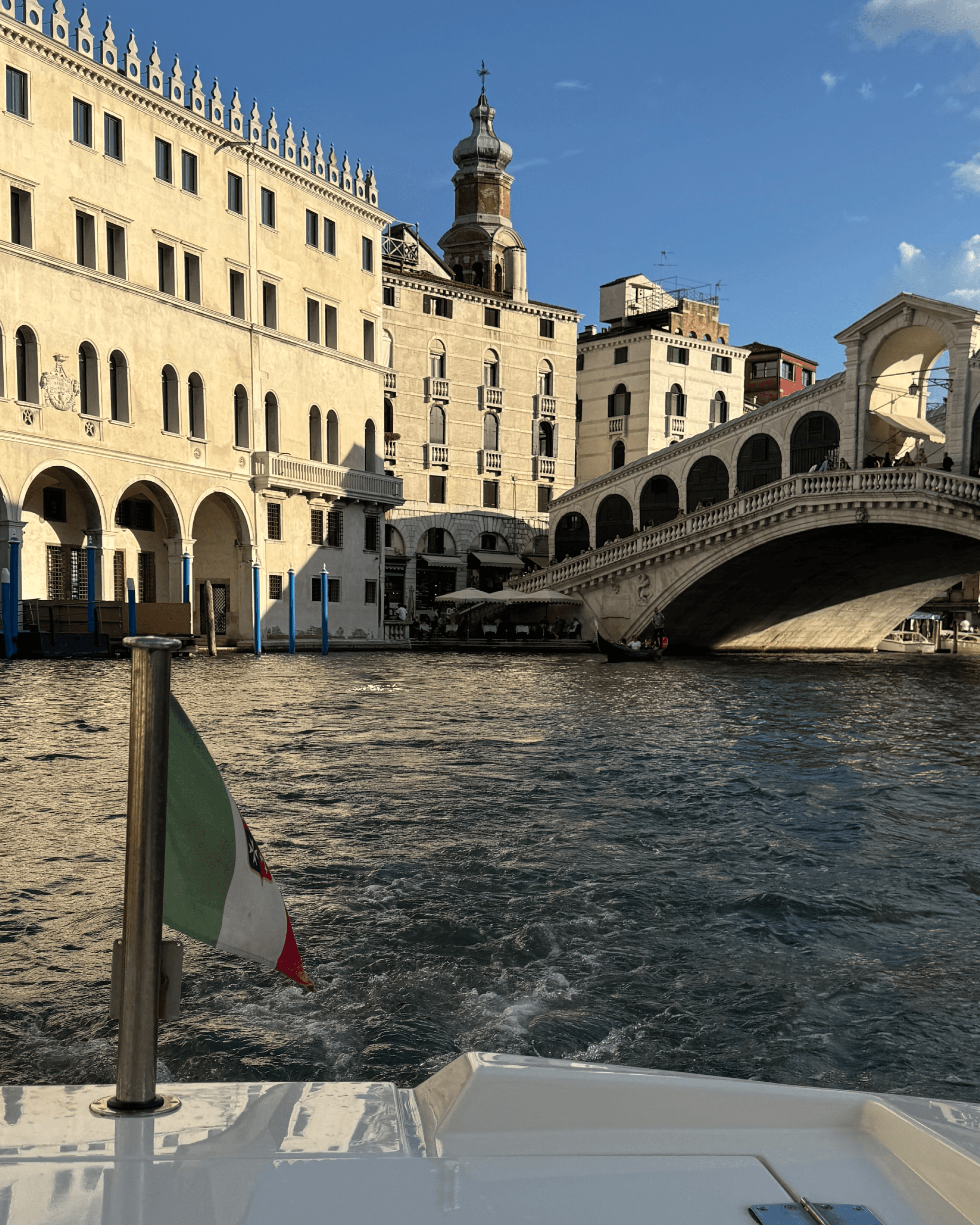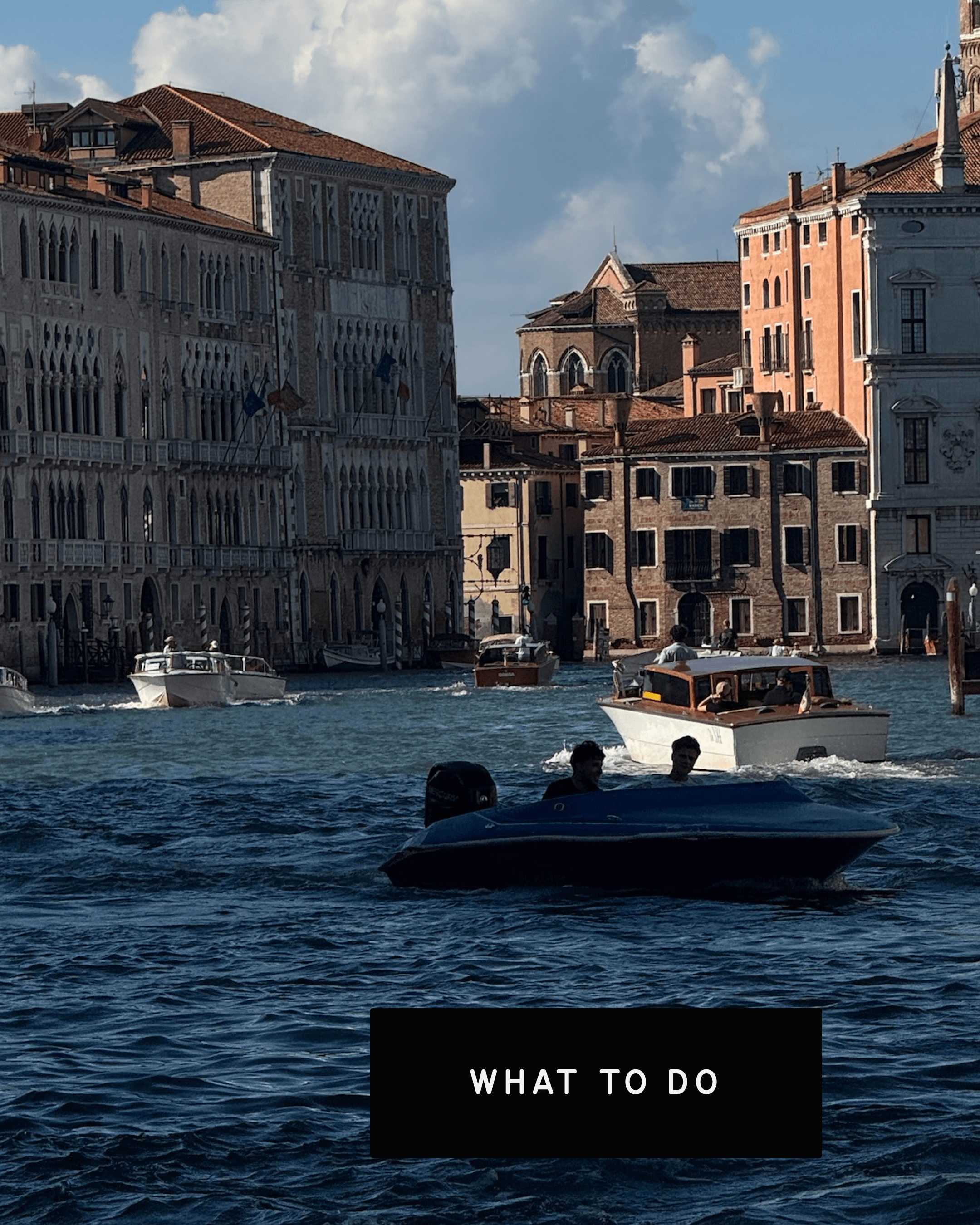 Take in the beautiful city. Venice is one of my favorite cities in the world. It is so uniquely beautiful for the obvious reason of being on the water but it's also brimming with history, great food and incredible shopping. Besides just walking around and taking it all in, I would prioritize taking a water taxi at sunset. Getting around by boat can be challenging at times but I think that being surrounded by water has a distinct way of calming the mind. The way the light reflects off the canal onto the gorgeous historical buildings is something that must be experienced.